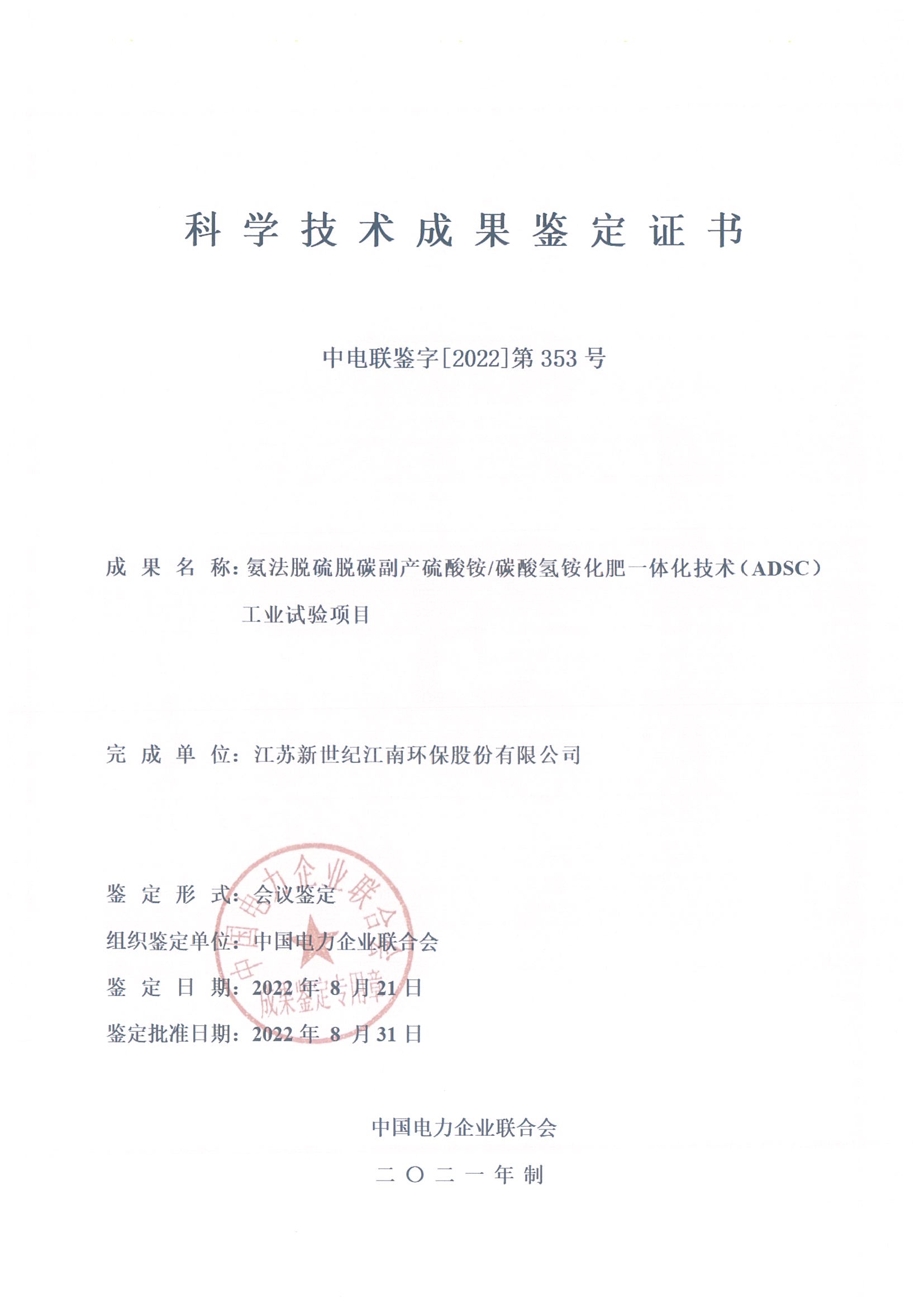 8月21日,由中国电力企业联合会主办的氨法脱硫脱碳副产硫酸铵/碳酸氢铵化肥一体化技术(ADSC)工业试验项目科技成果通过国家级鉴定。鉴定会专家组一致认为,该项目成果达到国际领先水平,建议推广应用。