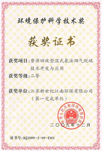 获得国家科技部奖项:由公司独立完成的自主知识产权的“资源回收型湿式氨法脱硫技术开发与应用”荣获国家环保科技奖二等奖。