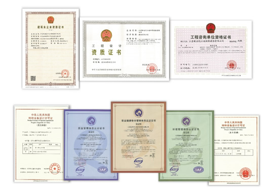 化工工程甲级设计资质;环保工程甲级设计资质;环保设施甲级运营资质;环保工程建设承包资质; 压力管道设计资质;压力容器设计资质;ISO9001质量体系认证;ISO14001环境管理体系认证;GB/T28001职业健康安全管理体系认证。