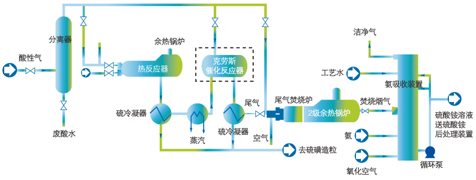 煤化工低温甲醇洗、酸水汽提、炼油酸水汽提及溶剂再生装置产生富含H2S、有机硫的酸性气。江南环保酸性气处理技术采用克劳斯硫回收+氨法脱硫技术处理酸性气,与传统两级克劳斯+SCOT、三级克劳斯+SCOT、超级克劳斯、超优克劳斯工艺相比,不仅能够达标排放,而且还有较大提标空间,副产硫酸铵,变废为宝,实现循环经济。